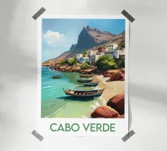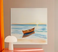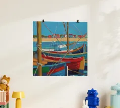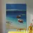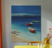 Rowboats dot a vivid blue shoreline, their red hulls contrasting sharply against white sand and water.