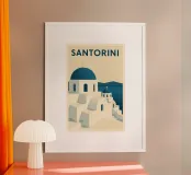 Poster retrò di Santorini, che celebra le sue famose cupole blu e le abbaglianti facciate bianche affacciate sul Mar Egeo. Una composizione pura che cattura l'eleganza e la luce delle Cicladi, perfetta per un arredamento mediterraneo chic.