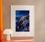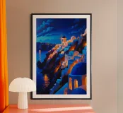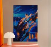 Questo affascinante dipinto a olio mostra il fascino del paesaggio notturno di Santorini. Le iconiche cupole blu, le case imbiancate e gli stretti sentieri sono illuminati da luci calde che creano un contrasto abbagliante con il ricco blu del cielo crepuscolare e del Mar Egeo. Le magistrali pennellate del dipinto conferiscono profondità e dettaglio a ogni angolo, celebrando l'atmosfera romantica e serena dell'isola. Quest'opera d'arte è un omaggio alla bellezza senza tempo e all'essenza culturale di Santorini sotto l'incantesimo della notte.