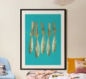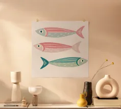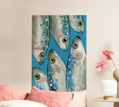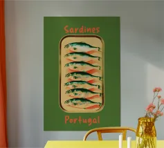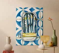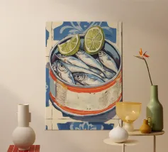 Aggiungete un tocco costiero giocoso al vostro spazio con questa stravagante opera d'arte digitale che raffigura sardine appese a mollette su uno sfondo turchese brillante. Questo pezzo, che unisce surrealismo e fascino marino, unisce umorismo, colore e tradizione marittima in uno stile fresco e moderno. Perfetto per cucine, case al mare o per gli amanti della cultura mediterranea e dell'arredamento nautico con un tocco di divertimento.