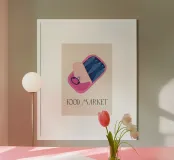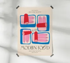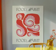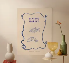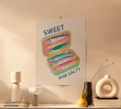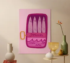 Questo simpatico poster di scatole di sardine presenta un'illustrazione giocosa di sardine blu brillante disposte ordinatamente all'interno di una scatola rosa. La palette di colori vivaci e le forme semplici conferiscono un fascino divertente e moderno, con un pizzico di stile retrò al packaging. Perfetto per aggiungere personalità alla cucina, all'angolo pranzo, al caffè o alla casa d'ispirazione costiera, dà un tocco allegro e stravagante agli spazi quotidiani. Spensierato ed elegante, questo pezzo è ideale per chi ama la food art, il design minimale o l'arredamento eccentrico della cucina.