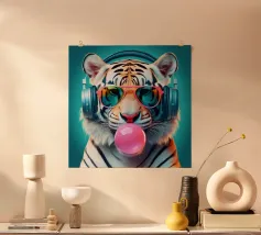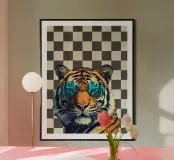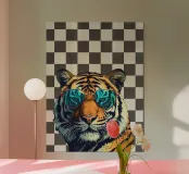 Questa tigre audace ed elegante, che sfoggia occhiali da sole riflettenti su uno sfondo a scacchiera vintage, conferisce un atteggiamento feroce e un tocco moderno a qualsiasi spazio. Un mix perfetto di energia selvaggia e disinvoltura.