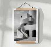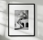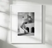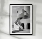 Poster in bianco e nero dell'architettura mediterranea: una scala curva che sale su una torre bianca, archi e stucchi inondati di luce, con l'orizzonte del mare sullo sfondo. Le linee fluide e i volumi morbidi creano una grafica rilassante. Questo poster da parete conferisce movimento, eleganza e profondità al soggiorno, al corridoio o alla camera da letto e si adatta a decori contemporanei, scandinavi, japandi o bohémien chic.