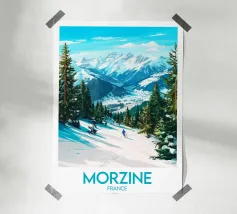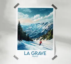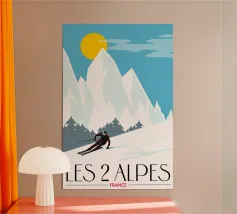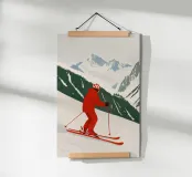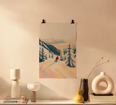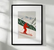 L'immagine mostra una scena dinamica di sport invernali: una persona con un vistoso abbigliamento da sci rosso scia lungo un pendio di montagna innevato. Le linee chiare e i colori decisi conferiscono all'illustrazione uno stile moderno, quasi grafico. Le montagne innevate e gli abeti stilizzati sullo sfondo creano uno sfondo atmosferico che enfatizza il movimento e la vicinanza alla natura allo stesso tempo. Sembra un misto di energia sportiva e tranquillità paesaggistica.