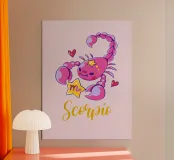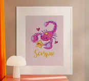Una simpatica e colorata illustrazione del segno zodiacale dello Scorpione. Questo scorpione dall'aspetto giocoso, con dettagli a forma di cuori e stelle, rappresenta lo spirito intenso e affascinante dello Scorpione. Ideale per gli amanti dell'astrologia che desiderano aggiungere un tocco vivace e divertente al proprio spazio.