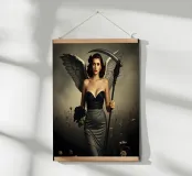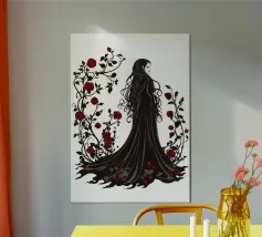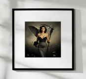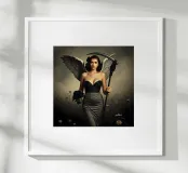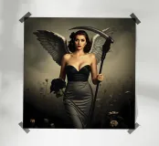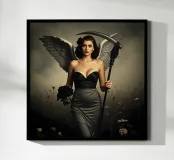 Sultry Angel of Death Pin-Up in Noir Style This image shows a striking pin-up model as the Angel of Death, posing in a dramatic field of withered flowers, surrounded by haunting mist, with a scythe and black roses, in a blend of 1940s film noir and elegant pin-up art.