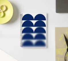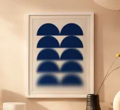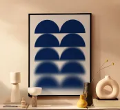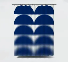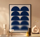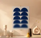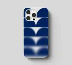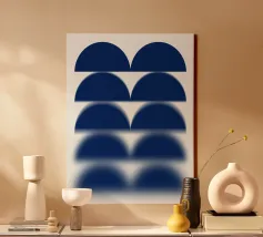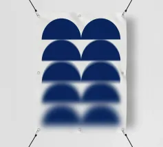 I semicerchi blu scuro sono disposti in file ordinate, aumentando gradualmente la sfocatura dall'alto verso il basso. Il disegno crea un senso di profondità e movimento, attirando l'occhio attraverso il suo schema simmetrico.