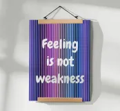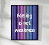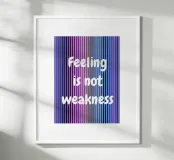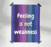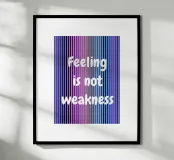 Un'immagine grafica con sfumature verticali nei toni del viola, blu e nero, sovrastata dalla chiara scritta bianca "Feeling is not weakness" (Sentire non è debolezza). Appare come una dichiarazione tranquilla e sicura di sé sulla forza emotiva e la vulnerabilità.