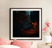 serata in una vecchia baita circondata da nebbia e foglie d'autunno poster con telaio in legno