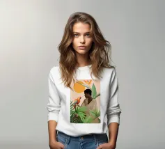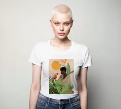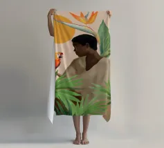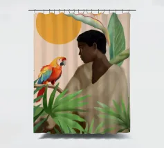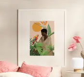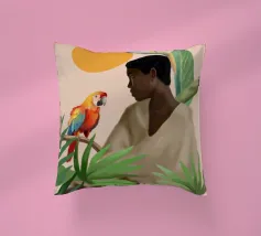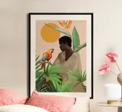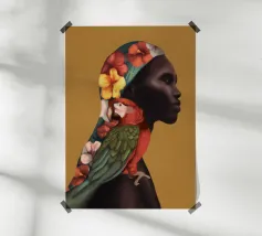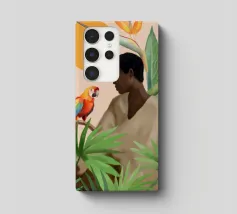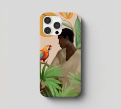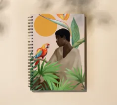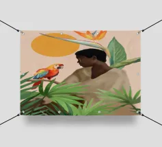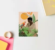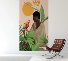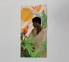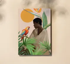 Sognante dipinto digitale di una persona che guarda un pappagallo vivace, circondato da piante tropicali e da un sole splendente. Quest'opera d'arte irradia calma, connessione e la bellezza del mondo naturale. Perfetto per ambienti boho, ispirati alla giungla o tropicali. Ideale per camere da letto, spazi creativi o per chiunque ami gli uccelli colorati, i momenti di pace e le vibrazioni esotiche e terrene. Un regalo d'anima per gli amanti della natura e per i collezionisti d'arte.