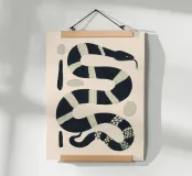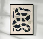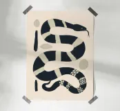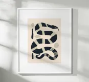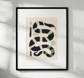 Un serpente minimale e stilizzato in bianco e nero, arrotolato in morbide curve su uno sfondo neutro.