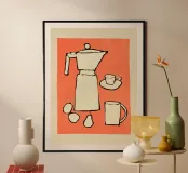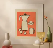 Porta un tocco di stile alla tua cucina con il poster artistico "Coffee Set". Questa opera d'arte, caratterizzata da un'illustrazione vivace di una caffettiera e tazze, è perfetta per gli amanti del caffè e aggiunge personalità a qualsiasi ambiente. Realizzato con materiali di alta qualità, è un must per la tua collezione di decorazioni murali.