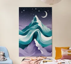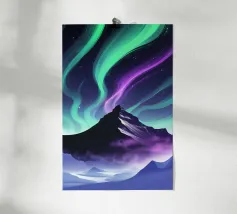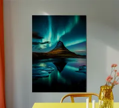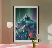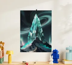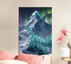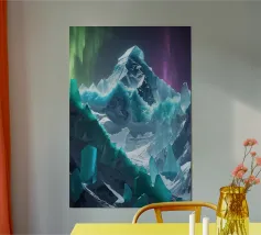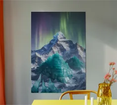 In questa ipnotica opera d'arte, il Monte Everest è circondato da frammenti cristallini sparsi che brillano di blu e verde ghiacciati. Il cielo sovrastante è animato da vivaci aurore che proiettano un bagliore magico sulle strutture geometriche di ghiaccio. La combinazione di formazioni di ghiaccio spigolose e taglienti e la bellezza organica delle aurore crea una composizione al tempo stesso fantastica e serena. Una vera e propria celebrazione della grandezza della montagna attraverso un obiettivo fantasioso.