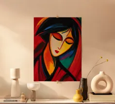 Ein Gesicht, geteilt in drei Farben – feuriges Rot, tiefes Schwarz und warmes Gold. Die linke Hälfte scheint in Flammen zu stehen, während die rechte Seite in dunkler Stille versinkt. Die geschlossenen Augen symbolisieren innere Ruhe oder vielleicht ein verborgenes Geheimnis. Die fließenden Farbübergänge erinnern an Emotionen, die sich unaufhaltsam vermischen – Leidenschaft, Dunkelheit und Hoffnung. Ein Bild, das Gegensätze vereint und eine tiefe, rätselhafte Atmosphäre schafft.