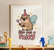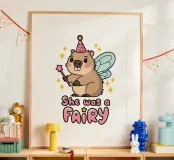 Un simpatico capibara dei cartoni animati è raffigurato come una fata con ali blu pastello e un cappello rosa, con in mano una bacchetta magica. Intorno ci sono piccole stelle e una didascalia scherzosa recita: "Era una fata".