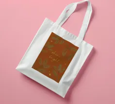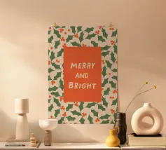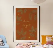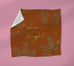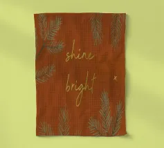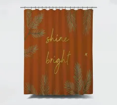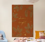 Un'illustrazione per la stagione invernale! Uno sfondo marrone rossastro con ramoscelli di pino, stelle e il testo "Shine bright" in look dorato. (Non è un foglio d'oro!)