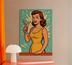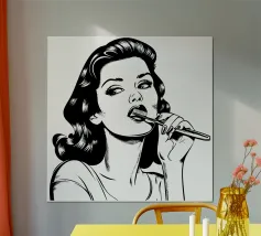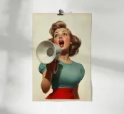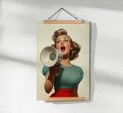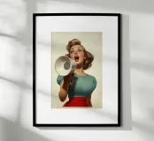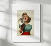Una donna elegante con capelli e abiti ispirati agli anni '50 grida attraverso un megafono, emanando sicurezza ed energia. La tavolozza di colori vintage e la posa drammatica evocano nostalgia e audacia in questa composizione artistica retrò.