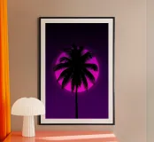 Silhouette di palma contro cerchio rosa su arte viola poster