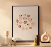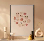 Stampa artistica con cornice in legno dall'illustrazione 'Smileys' di studio stine, perfetta per decorare la cameretta o il soggiorno con un tocco giocoso e moderno. Design semplice e colorato, ideale come regalo originale per bambini e appassionati di arte minimale.