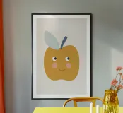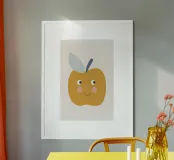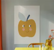 Una graziosa illustrazione di una mela sorridente in un caldo giallo senape con dolci guance arrossate e piccoli occhi espressivi. Caratterizzata da un picciolo blu scuro e una foglia blu tenue, questa giocosa opera d'arte raffigurante un frutto è perfetta per decorare le pareti della cameretta dei bambini, l'arredamento della loro stanza e gli allegri spazi della sala giochi.
