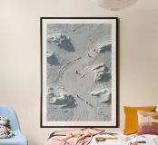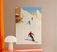 Quest'opera rivela una veduta aerea di sciatori che si muovono tra ampie forme di neve scolpita che assomigliano a correnti fluide. Le pennellate spesse e stratificate creano una superficie tattile, sfumando il confine tra paesaggio e astrazione. Le piste tortuose guidano l'occhio attraverso la composizione, mentre le piccole figure forniscono una scala e un senso di movimento silenzioso. Il gioco di luci, ombre e texture trasforma la pista invernale in una meditazione visiva sul movimento, sul ritmo e sulle tracce transitorie lasciate dalla presenza umana, ideale per spazi contemporanei e stampe d'arte di grande formato.