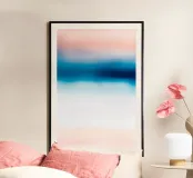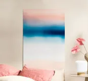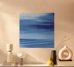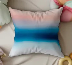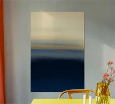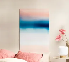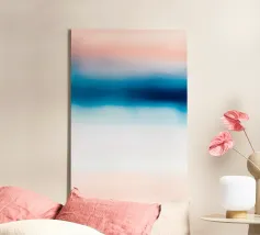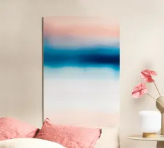 Un sereno gradiente astratto che mescola i toni del rosa tenue con i vibranti blu dell'oceano, creando un sognante flusso orizzontale che ricorda un tranquillo orizzonte costiero. Il movimento pittorico fluido e la texture sottile evocano un senso di pace e spaziosità, rendendo quest'opera d'arte ideale per l'arredamento moderno delle pareti, le stampe d'arte, i poster, l'interior styling, il branding e il design digitale. La tavolozza di colori rilassanti e la composizione minimalista conferiscono un'estetica raffinata e tranquilla a qualsiasi spazio.