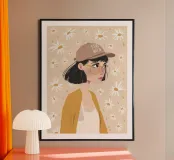 Ritratto dai colori tenui di una ragazza pensierosa con occhiali e berretto, circondata da fiori simili a margherite.