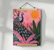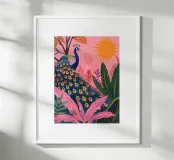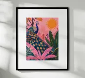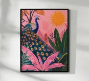 Un'impressionante opera d'arte tropicale con un maestoso pavone che si crogiola sotto il sole, circondato da vibranti foglie di palma rosa e dal fogliame della giungla. Questa illustrazione in stile bohémien fonde l'eleganza esotica con un colore moderno e giocoso, rendendola perfetta per gli amanti dell'arredamento tropicale, per le camere da letto bohémien moderne o come opera d'arte di grande impatto in rosa. Un grande regalo per gli amanti dell'estate, del pavone o per i collezionisti di arte vivace. Ideale per le pareti di Wohnzimmer, Schlafzimmer o Kinderzimmer.