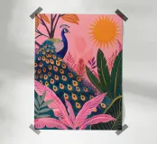 Sole di pavone boho nella giungla tropicale con foglie di palma rosa poster con telaio in alluminio