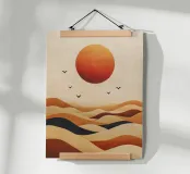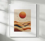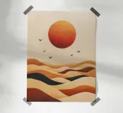 Illustrazione artistica di un paesaggio desertico con un sole rosso intenso che fluttua sopra dune ondulate in tonalità terrose. Un poster perfetto per una decorazione murale calda e minimalista, ideale per un ambiente rilassante e bohémien.