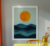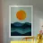 Illustrazione minimalista che raffigura un grande e vibrante sole arancione sopra onde ondulate in diverse tonalità di blu. Questo disegno pulito cattura la bellezza naturale dei paesaggi marini con un'estetica contemporanea, ideale per evocare serenità ed evasione in uno stile moderno e rilassante.
