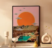 Sono arrivati! Atterraggio di UFO nell'opera d'arte del deserto. Astronavi che arrivano a una festa in piscina nel deserto dell'Arizona, con un cielo rosa e un sole arancione come sfondo. Gli alieni sono qui! Surreale collage digitale retrò di MsGonzalez