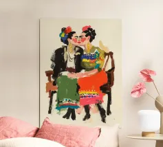 Due figure stilizzate sono ritratte a stretto contatto, condividendo quello che sembra essere un momento di intimità. L'uso di colori vivaci e forme semplici conferisce all'immagine un'atmosfera moderna e astratta.