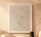 Disegno al tratto minimalista di una figura femminile nuda che si copre modestamente il petto. Un delicato equilibrio tra vulnerabilità e forza, plasmato in un unico tratto astratto - silenzioso ma potente.