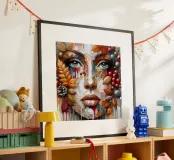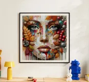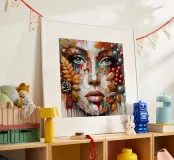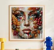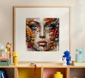 Ritratto di un volto realizzato con una tecnica strutturata, quasi a mosaico, con pennellate spesse e stratificate e con tamponamenti di colore. Il volto è composto da vari colori, che mescolano i toni naturali della pelle con spruzzi di rossi, arancioni, blu e viola vivaci.