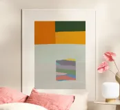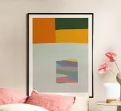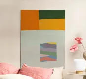 La composizione รจ dominata da audaci blocchi di colore, con un'enfasi sull'arancione e sul verde nella parte superiore e uno sfondo chiaro piรน tenue. Un rettangolo piรน piccolo con un disegno multicolore e stratificato รจ centrato sullo sfondo chiaro, creando un contrasto sorprendente.