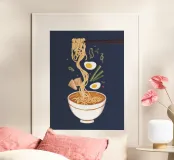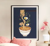 Un'illustrazione drammatica mostra le bacchette che sollevano i noodles da una ciotola di ramen su uno sfondo blu scuro, mettendo in evidenza il vapore e gli ingredienti saporiti.