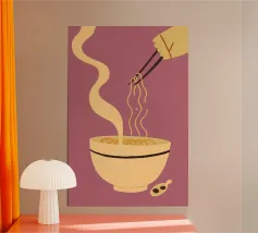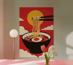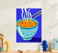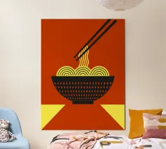 Audace e giocosa, questa illustrazione grafica pop art presenta spaghetti giallo brillante sollevati da bacchette su uno sfondo rosso vibrante: un'eccentrica celebrazione del divertimento, del cibo e del colore.