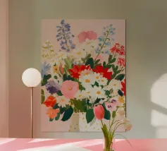 Un delicato bouquet primaverile disposto in un vaso di vetro trasparente in toni pastello. Quest'opera d'arte celebra la freschezza, il rinnovamento e la tranquilla eleganza, perfetta per gli interni luminosi e per gli amanti della sottile bellezza floreale.