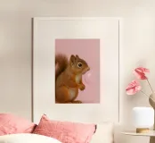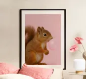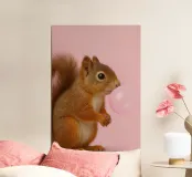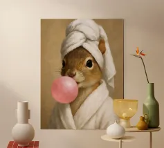 A charming and playful portrait of a squirrel blowing a shiny pink bubblegum bubble against a soft pastel background. This whimsical animal artwork adds humor and personality to any space, perfect for animal lovers, kids’ rooms, or quirky modern decor.