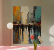 Immergetevi nel caos vibrante della vita urbana con questo capolavoro astratto. Audaci spruzzi di arancione e toni tenui creano uno sfondo dinamico, catturando l'essenza di una metropoli vivace. Le figure si muovono nella foschia, incarnando il ritmo degli abitanti della città che navigano nel loro tran tran quotidiano. È un'istantanea dell'esistenza moderna, dove l'anonimato incontra la connessione. Perfetto per chi apprezza il ritmo della vita cittadina e le storie nascoste in ogni angolo.