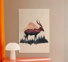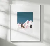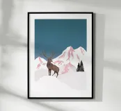 Paesaggio invernale ridotto con cervi e forme chiare di montagna.