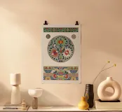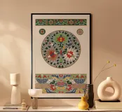 Immergete il vostro spazio nell'intricata bellezza di questo vibrante "Chinese Circular Design Ornament", un esempio di ornamento cinese proveniente da collezioni storiche, che ricorda i motivi dell'arte turca. Questa accattivante stampa presenta un medaglione circolare centrale ornato da fiori stilizzati e fogliame vorticoso in un'incredibile gamma di rossi, blu, verdi e tenui colori pastello, su un sereno sfondo azzurro. A complemento di ciò, il bordo inferiore presenta un motivo decorativo di grande effetto con il volto stilizzato di un drago o di una bestia, ricco di colori e di dettagli, mentre il bordo superiore floreale completa il quadro.