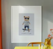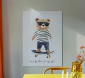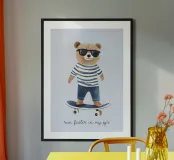 Questo poster digitale divertente ed elegante presenta un simpatico orsetto su uno skateboard. L'orso indossa una camicia a righe, pantaloni blu e un paio di occhiali da sole alla moda, con un'espressione sicura e sorridente. La citazione umoristica "run faster in my pj's" (corri più veloce in pigiama) è scritta a mano sotto, aggiungendo un tocco giocoso e spiritoso. L'illustrazione ha una texture morbida e acquerellata, su uno sfondo azzurro rilassante. Questo download digitale di alta qualità (7000x5000 pixel, 300 dpi) è un'aggiunta perfetta alla cameretta di un bambino o a uno spazio abitativo moderno, che celebra il divertimento e l'individualità.