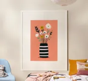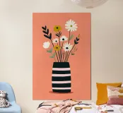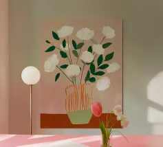 Semplici fiori bianchi e gialli si ergono da un vaso a righe, i cui steli sottili creano un ritmo delicato su un caldo sfondo corallo. Il contrasto tra la forma strutturata e la crescita organica evoca una sensazione di felicità radicata - una gioia calma, costante e tranquillamente fiduciosa. Un pezzo floreale minimalista che dona calore, chiarezza e un senso di tranquillità a qualsiasi spazio moderno.