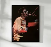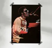 immerso in una performance dal vivo, cantando con passione mentre suona la tastiera, indossando occhiali da sole e una camicia decorata in modo unico sotto i riflettori",