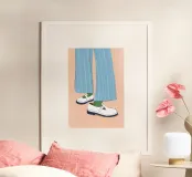 Un'illustrazione di moda semplice e minimalista che si concentra sulla metà inferiore di una persona che indossa pantaloni a gamba larga blu chiaro e scarpe da ginnastica bianche alla moda, trasmettendo un senso di disinvoltura e disinvoltura.