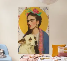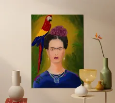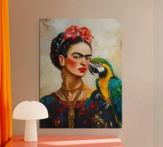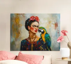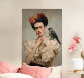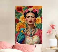 Il murale di moda mostra Frida Kahlo in stile boho con un uccello sulla spalla, circondata da motivi floreali e colori tenui della terra.