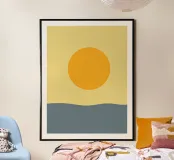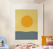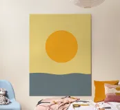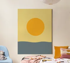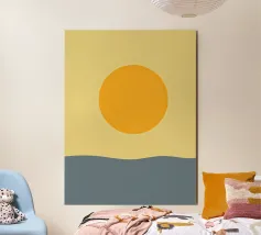 Una composizione minimalista con un caldo sole dorato che si posa su un orizzonte morbido e fluente. I toni tenui del giallo e del blu creano un'atmosfera calma ed equilibrata, evocando mattinate tranquille e un senso di presenza costante. Le forme pulite e il delicato contrasto rendono quest'opera d'arte un pezzo senza tempo, perfettamente adatto a interni moderni, scandinavi e contemporanei.