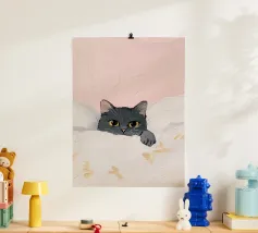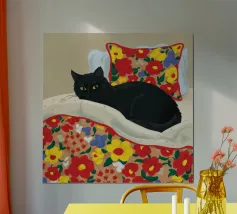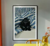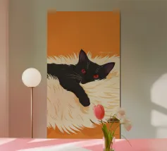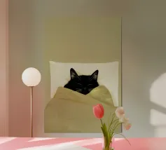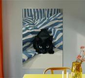 Quest'opera d'arte esplora una tensione tranquilla attraverso un linguaggio pittorico sobrio. Il gatto nero, reso con profonde ombre opache e luminosi occhi blu, diventa un punto focale di presenza e consapevolezza. Le strisce circostanti si dissolvono in pennellate espressive, creando un ambiente ritmico che sembra allo stesso tempo avvolgente e protettivo. Il contrasto tra le morbide trame tessili e lo sguardo vigile introduce un dialogo tra comfort e vigilanza. Elementi narrativi minimi permettono all'emozione di emergere attraverso l'equilibrio dei colori, la texture della superficie e la composizione, conferendo all'opera un carattere contemplativo e contemporaneo.